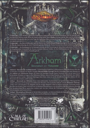 Arkham - Hexenstadt am Miskatonic - In dem biederen Städtchen in Massachusetts schlägt das finstere Herz des verstörenden Universums von Mythen Schöpfer Howard Phillips Lovecraft. Manche Einwohner haben eine Ahnung von den anderen und schwärzeren Dingen, die hinter der brüchigen Fassade lauern. Entsetzen rührt sie an, wenn sie im leichenhaftem Zwielicht zu lange in den Miskatonic blicken, wenn sie beim Passieren der Orne-Bibliothek eines kühlen Luftstroms gewahr werden. Alpträume bedrängen ihren Geist, wenn sie an die scheußlichen Legenden denken, die nur flüsternd in den Schatten erzählt werden.