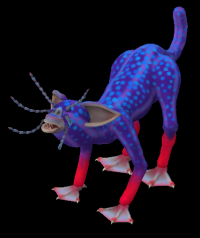The Uranian Cat, which dwells in the bizarre Dreamlands of Uranus, is closely related to the Saturnian cat, but is far more hideous and malicious. It is also larger and has fang-like teeth as well as six spike-like whiskers around its head, which sages assume serve as antennae that can detect certain forms of energy over large distances. Powerful in appearance and dark of hue, a Cat from Uranus has a thick coat of black, blue, or green webbed tentacles and a long tail. The creature resembles a very large cat, almost the size of a sheep. Shy and alert, and very fleet of foot, a Cat from Uranus is very intelligent and can even speak human language, as well as communicate with other Dreamlands cats. Its skin is very valuable for the fact that it cannot be cut or pierced in any way by steel, only by silver — perfect for the making of armor that will protect the wearer from anything save weapons made of silver. It is said to be very dangerous to hunt a Cat from Uranus, however, as their gaze can kill any man. Popular wisdom says that the only way they can be killed is by magic or with silver-headed arrows.