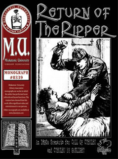 MISKATONIC UNIVERSITY LIBRARY ASSOCIATION monographs are longer works by one or more authors on a subject of import to Call of Cthulhu roleplayers. On these products the author has also fulfilled the functions of editor and layout artist. Monographs are digitally reproduced small run publications featuring cardstock covers and tape bindings. Through the publication of monographs Chaosium offer their most loyal fans more information more easily, and evaluate the potential of these works for eventual release to the wholesale market.