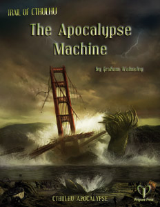 The Apocalypse Machine continues the investigations of Trail of Cthulhu in a post-apocalyptic world. In these pages, you will find instructions on designing your own apocalypse; new Occupations, Skills and Drives, and explanations of how the old ones function in this post-apocalyptic world; and many ways for the Mythos to take over.
