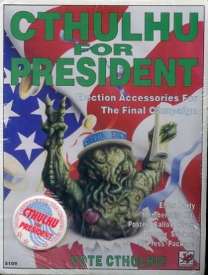 This package of novelty items, themed around Cthulhu's campaign for the 1992 U.S. Presidency, contains the following items: