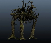 The Dark Young are horrifying, pitch-black monstrosities, seemingly made of ropy tentacles. They stand as tall as a tree (perhaps between twelve and twenty feet tall) on a pair of stumpy, hoofed legs. A mass of tentacles protrudes from their trunks where a head would normally be, and puckered maws, dripping green goo, cover their flanks. The monsters roughly resemble trees in silhouette — the trunks being the short legs and the tops of the trees represented by the ropy, branching bodies. The whole mass of these things smells like an open grave. They usually dwell in woodlands wherever Shub-Niggurath's cult is active.