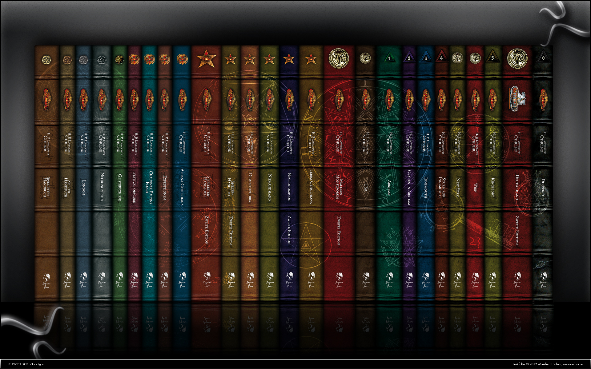 Wallpaper of the spine design of the German Cthulhu books by Manfred Escher. Uploaded with permission by Manfred Escher. Copyright Manfred Escher 2012.