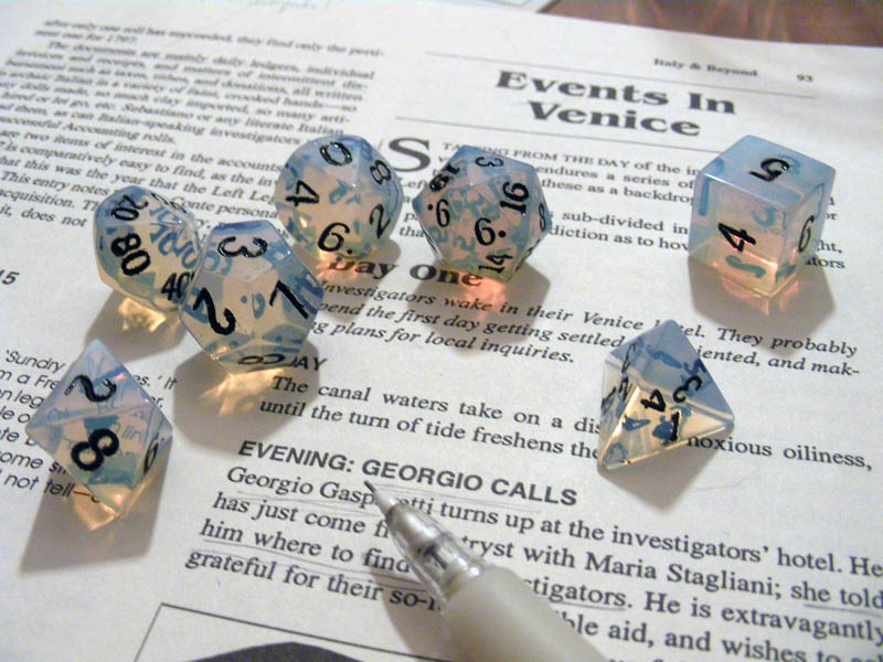 current18:56, 12 January 2008Thumbnail for version as of 18:56, 12 January 2008800 × 600 (125 KB)PoC (talk | contribs)The dice fall where they may... The Keeper's view of the Venice chapter. 16mm Opal dice by Crystal Caste.