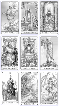 The "Major Arcana" of a typical Waite-Rider Tarot deck are presented below, for use with the mechanics above, to assist keepers in choosing appropriate Tarot cards for a given situation where the occultist investigator requests some guidance, to help keepers whose familiarity with Tarot is limited to the "Hollywood version" (in which there's definitely a Death card, and it's always bad, and maybe a Devil card, too, and that's also bad!)