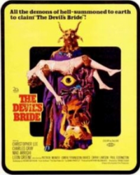 "All the demons of hell - summoned to earth to claim the Devil's Bride! The beauty of woman - the demon of darkness - the unholy union of the Devil's Bride! A Black Magic Story." An occult detective (Christopher Lee) and his skeptical friend discover to their horror that a young couple in the detective's charge have fallen under the spell of the leader of a satanic cult, and must disrupt the cult's plans to baptize the young couple into the cult, before it is too late!