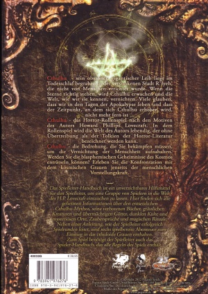 - Two books: The Cthulhu core rules are (once again, cf. the Laurin edition) divided into two books. This Spielleiter-Handbuch (Keeper Handbook), which has all the mythos related material (i.e. creatures, spells, scenarios, advice for running the game, ...) and the Spieler-Handbuch, which has all the rules and game-mechanics and information on the 1920s. This split was requested by the fandom. Reason being that players shouldn't have access to all the mythos knowledge.